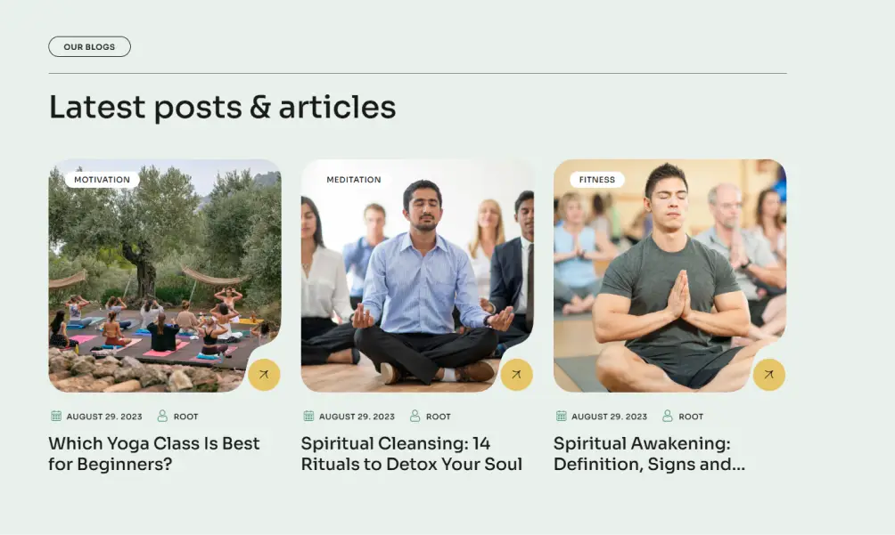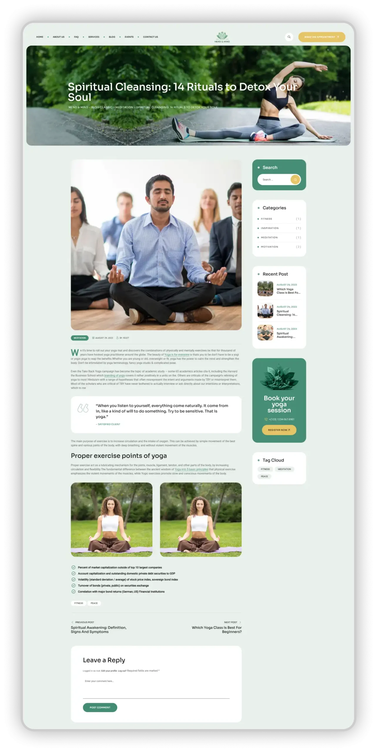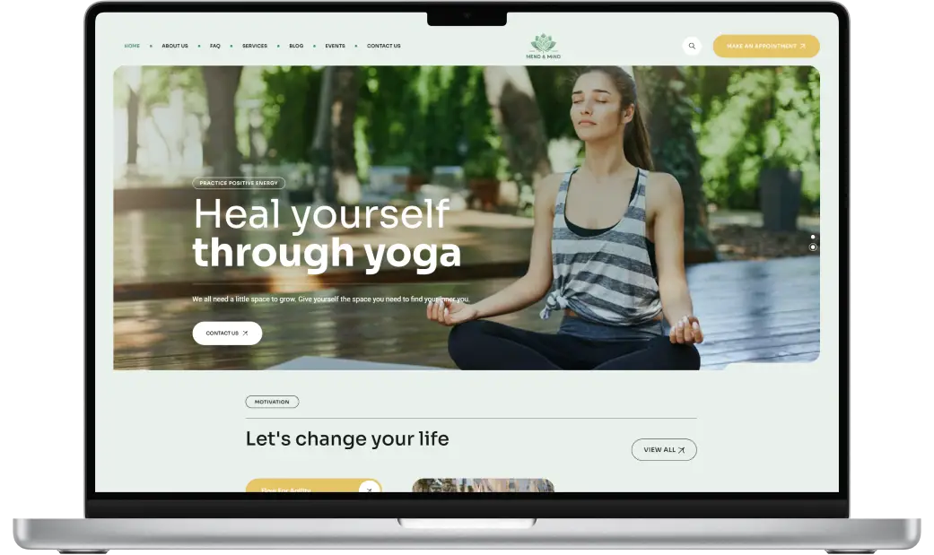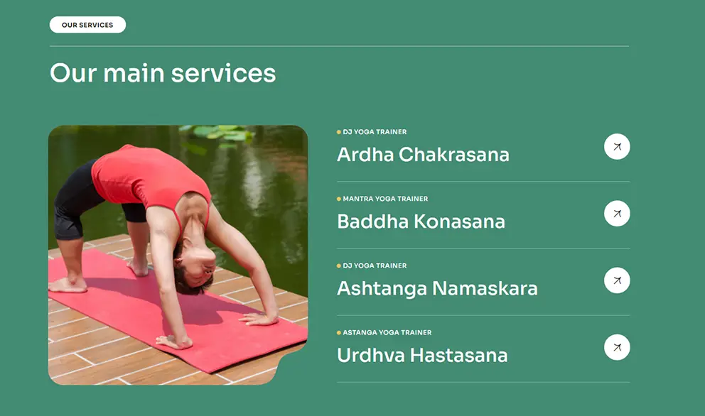 The design uses a split-screen layout with the left side displaying a full-width rounded image of a person performing yoga, creating an engaging and dynamic visual element. On the right side, a list of yoga services is presented in a clean, organized manner with clear headings for each service.